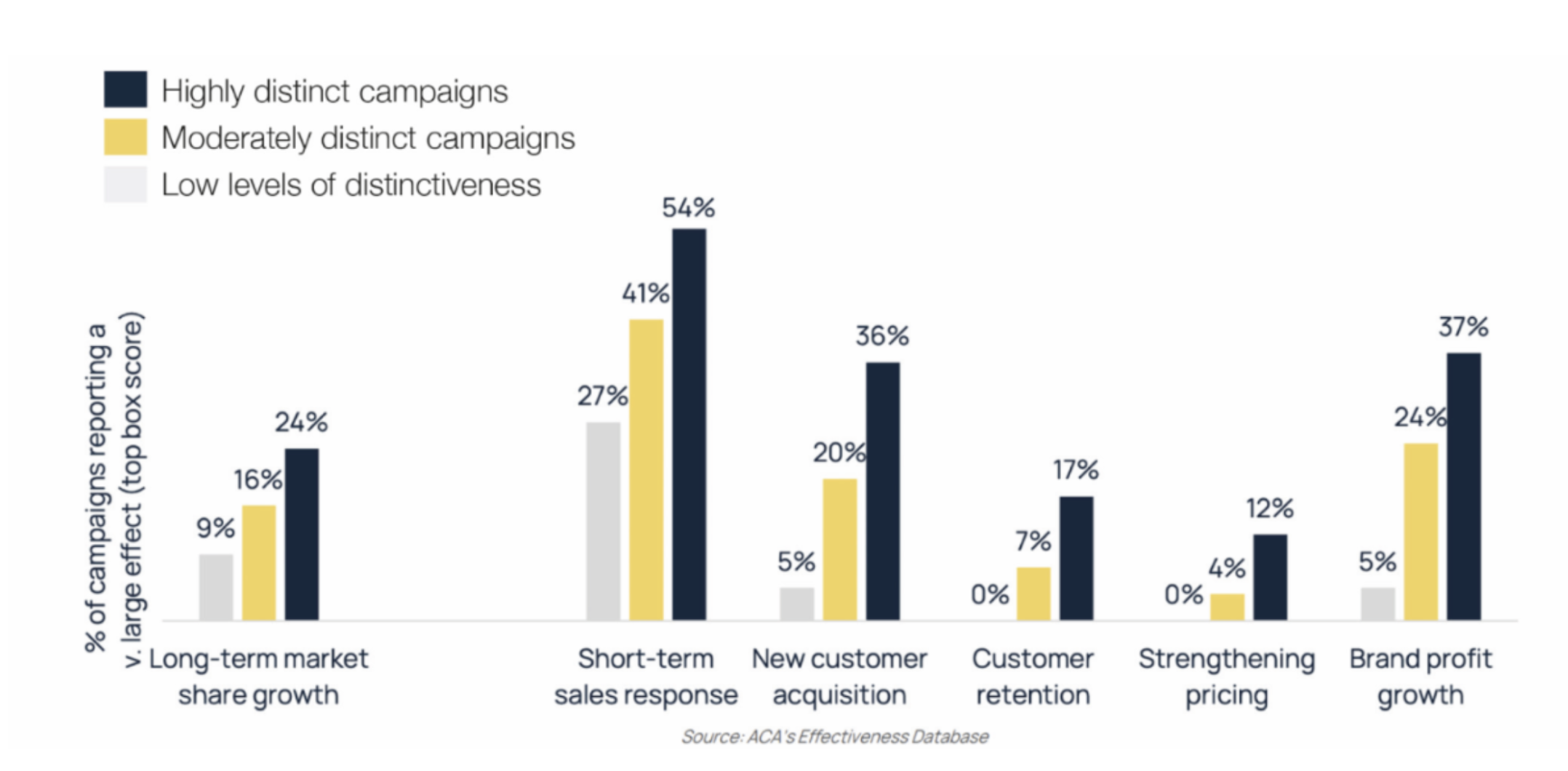 Memorable and distinct campaigns are shown to deliver greater long-term market share growth, short-term sales response, new customer acquisition, customer retention, strengthening pricing, and brand profit growth.