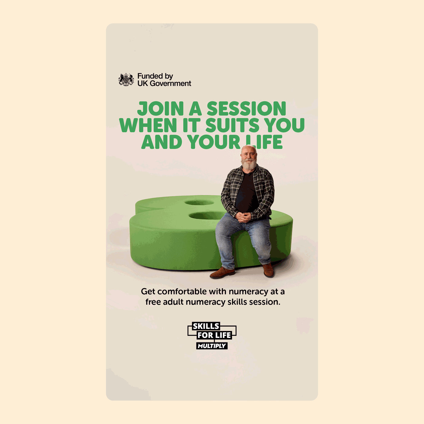 Therefore, the campaign was designed to help people feel comfortable with brushing up on their numeracy skills. The art direction, typography and copywriting all worked together to change the perception of adult learning environments. The campaign’s key visuals centred around brightly coloured numeracy sofas on which relatable learners sit comfortably.